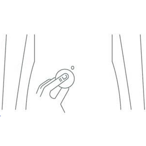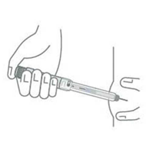- İnjektoru tutan əlinizlə iynəni dərinin içərisinə daxil edin. Tam inyeksiya edilməsinə əmin olaraq inyeksiya düyməsini sonuna qədər basın. Doza tənzimləmə düyməsini sıxaraq ən azı 10 saniyə iynənin dəridə qalmasına imkan verin (şəkilə baxın).